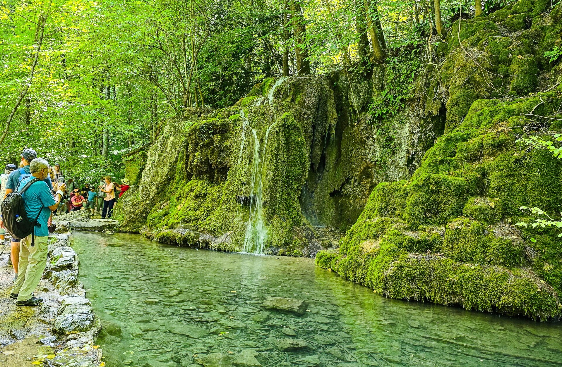 Mit 42 Teilnehmern fuhren wir nach Dettingen an der Erms. Hier stieg die Gruppe der Langwanderer aus. Für sie war eine gute Kondition erforderlich. Es waren gut 15 km und über 700 m im Anstieg und 650 m im Abstieg zu meistern. Zu Beginn waren gleich 300 Höhenmeter bis zu den Dettinger Höllenlöchern und dem Albtrauf zu bewältigen. In den Höllenlöchern ging es über Eisenleitern zwischen engen Felswänden ab- und aufwärts. Die anschließende Rast vor und in der nahen Schutzhütte sorgte für Erholung. Glücklicherweise verlief der Weg aber fast immer im Schatten. Nach der Rast ging es weiter zum Gütersteiner Wasserfall und nach langem Abstieg wieder nach oben zur Ruine Hohenurach. Nach kurzer Verschnaufpause und herrlichem Blick übers Ermstal folgte der Abstieg nach Bad Urach.