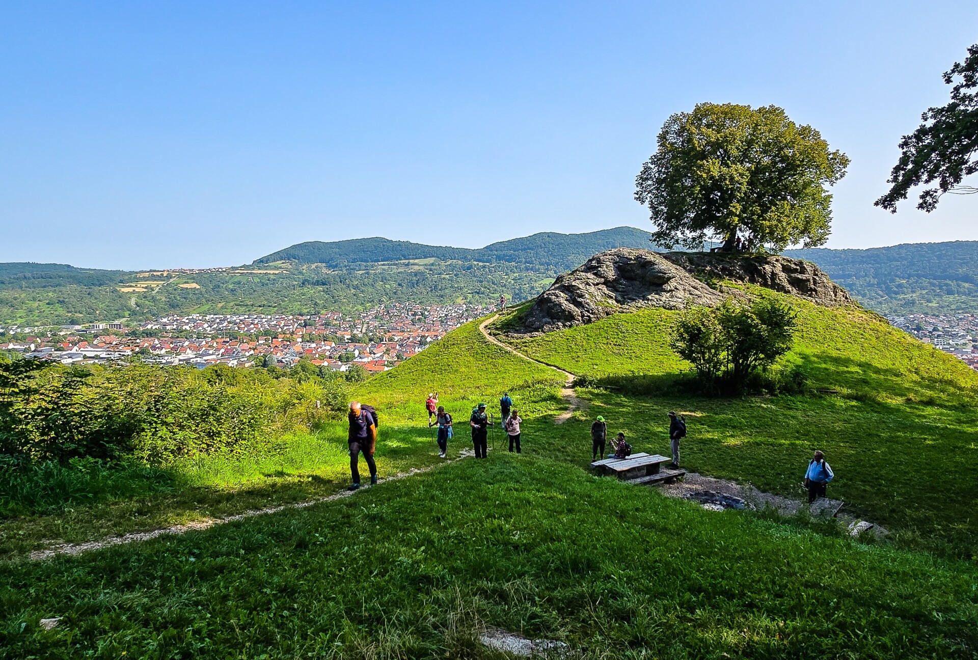 Die Kurzwanderer nahmen zur Bewältigung des Aufstiegs den Bus zum Startpunkt am Gestütshof in St. Johann. Über die Hohe Warte ging es zum Grünen Felsen von dem man einen hervorragenden Blick Richtung Norden hatte. Das nächstes Ziel war die Hochfläche Großer Platz bzw. Rossberg mit dem Segelflugplatz. Hier mussten wir längere Zeit auf freier Fläche wandern. Wir waren alle froh als es beim Sonnenfelsen wieder in den Wald ging. Über Dettingen hinweg reichte der Blick bis zur Ruine Hohenneuffen. Wenige Minuten später nahmen wir unser Vesper an der Hütte bei den Dettinger Höllenlöchern ein. Wir ließen es aber bei der Besichtigung von oben. Am Galgenberg entlang und vorbei an der Hohen Warte erreichte die Gruppe wieder den Gestütshof. Leider ist der Gestütsgasthof seit einigen Jahren geschlossen, im Hofladen konnten wir aber unseren Durst löschen.