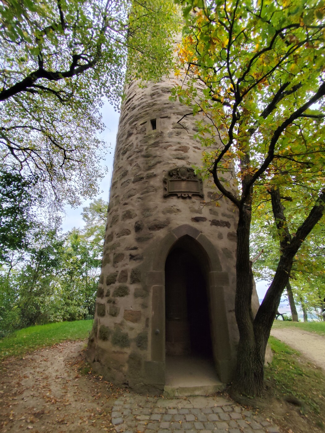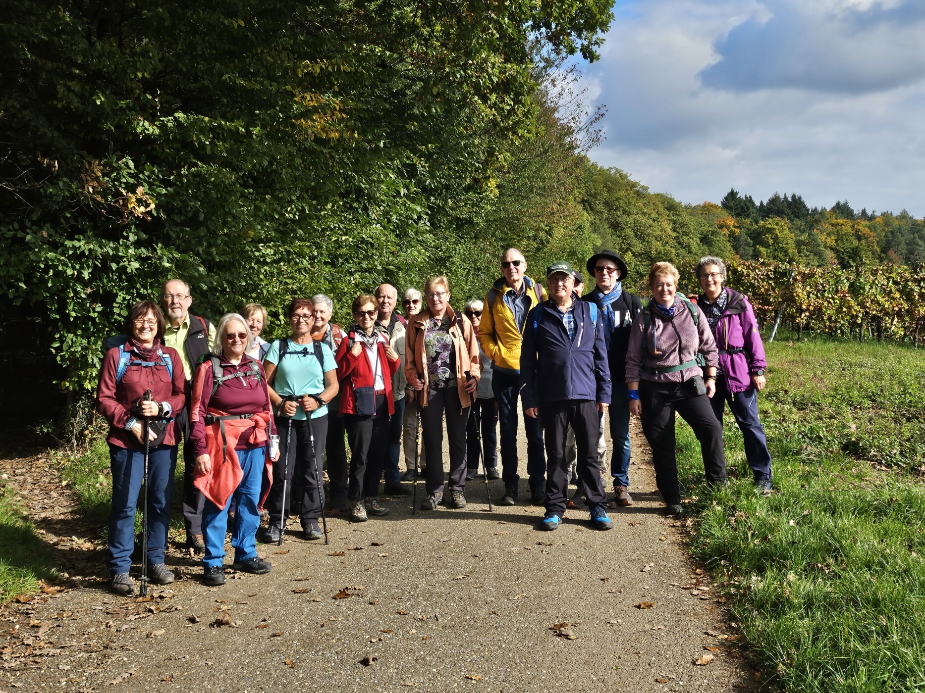 Zu Beginn der Wanderung durchquerten wir den Golfplatz Pfullinger Hof und wunderten uns, dass hier noch kein Betrieb herrschte. Wir wanderten aufwärts am Rande der bereits abgeernteten Weinberge und erreichten den Roten Brunnen, den höchsten Punkt der Wanderung. Von hier konnte man einen weiten Blick nach Norden in den Kraichgau werfen. In der Ferne ragte die Burg Steinsberg markant heraus. Ab hier ging es weiter auf dem HW8 – dem Frankenweg mit seinen schmalen idyllischen Pfaden. Erst oberhalb von Neipperg und den Weinbergen von Dürrenzimmern und Nordhausen konnten wir einen Blick nach Süden werfen. Inzwischen ließ sich auch die Sonne etwas mehr blicken. Auf der Heuchelberg Warte trafen wir auf die 15 Kurzwanderer die wenige Minuten zuvor hier eingetroffen waren. Diese Gruppe war mit ihrer Wanderführerin Trudel Jourdan in Schwaigern gestartet. Eine fantastische Aussicht in drei Richtungen sowie eine Rundumsicht vom Turm ließ die Teilnehmer noch einige Zeit dort oben verweilen. Nach dem Gruppenbild am Wartturm ging es gemeinsam weiter zum Lokal „Paradies“ bei den Sportplätzen von Leingarten. Trotz der großen Gruppe wurden wir hier flott und auch reichlich und gut verpflegt. Es war gut, dass man bis zum Bahnhof von Leingarten noch ca. 2 km laufen musste. Bei der Rückfahrt gab es dann glücklicherweise keine ungeplanten Verzögerungen sodass die Wanderer gegen 19 Uhr wieder nach Pforzheim zurückkehrten.